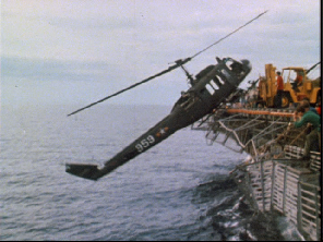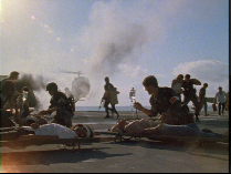Right after we see the famous shot of the fork lift pushing the helicopter off the flight deck and into the sea, we see what looks like injured soldiers on a ships deck. It is not. We have switched from S.E. Asia in 1975 to Miami 1985. Actually Key Biscayne. The helicopter is coming into the floating helipad at the former winter white house of President Richard Nixon. We have seen this property used in numerous episodes of Miami Vice such as Golden Triangle and The Great McCarthy as well as in the movie Scarface. They did a great job making this look like the deck of a Navy ship.