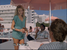 Next we go back to the O.C.B. (set) where the A.C. is not working. Then we return to the Barcelona to track down the Bartender. The bar was located just inside the front door in the hotel’s lobby. When Crockett walks Callie out back and onto the beach they are at the rear of the Hotel Barcelona.