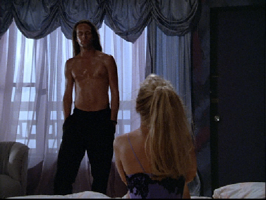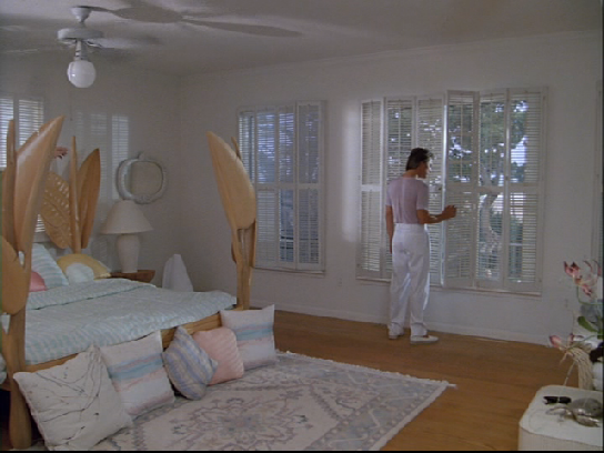 Goof: As Crockett is standing in the bedroom (we see this same bed used several times through out vice on different sets for example in #8 The Great McCarthy) waiting for Callie to come out of the shower, the hand of a crew member is seen reaching out from behind the bed and grabs the string connected to the ceiling fan. He yanks on it twice turning the fan on. Guess they weren’t alone after all.