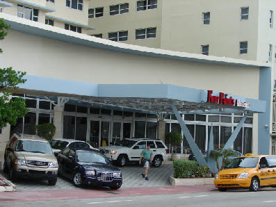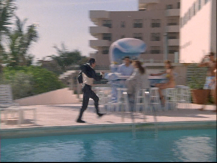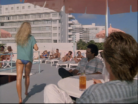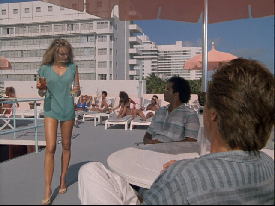 After the montage we are at a Miami Beach hotel. Crockett and Tubbs are on the job despite being the hottest day of the year and being slightly distracted by the scenery. This was filmed at what is now the Sheraton Four Points Hotel, 4343 Collins Avenue. At the time it was the Hotel Barcelona. We have seen this location used by Vice before in the episode, Lombard.