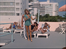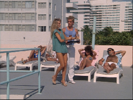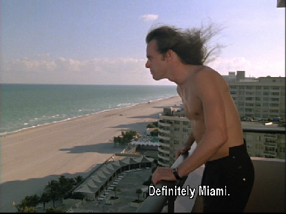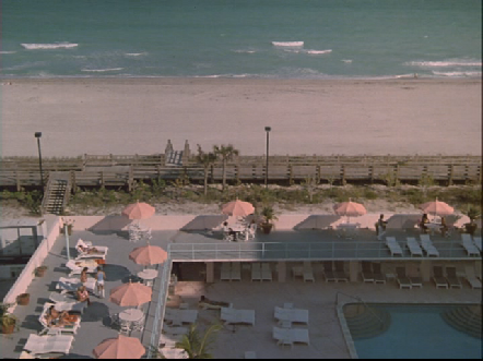 Then we cut to hotel room. He is out on the balcony enjoying the view and the weather. This was filmed at the Alexander Hotel, 5225 Collins Ave.