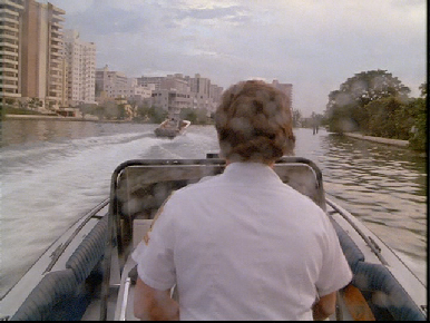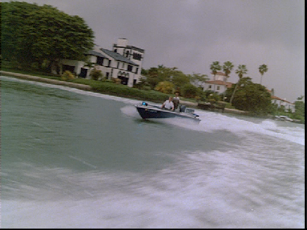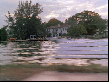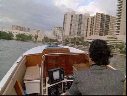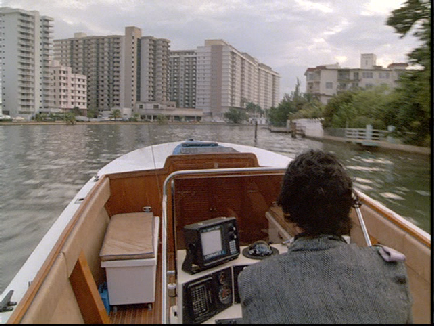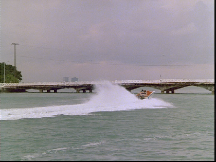 Then we see him wipe out a jet skier as he comes out of Surprise Lake Canal and turns south into Indian creek. This is where we saw Tubbs turn in Brother’s Keeper when he had stolen Crockett’s boat and was eluding Crockett. Tubb’s had been southbound on Indian Creek and turned west into the Surprise Lake Canal. Now we see Sagot come out of where Tubb’s had turned in.