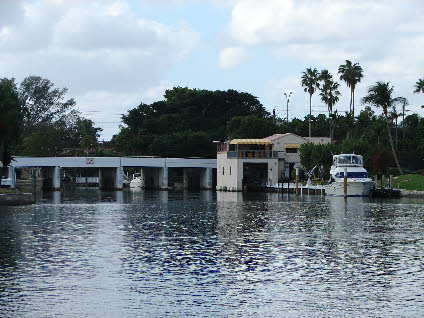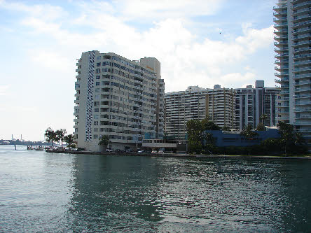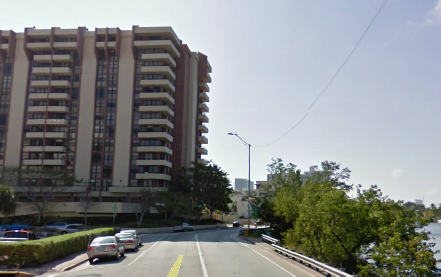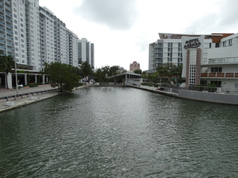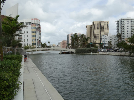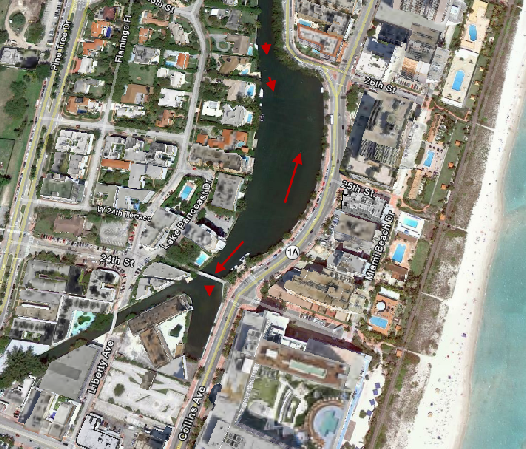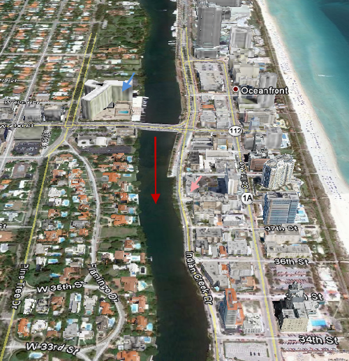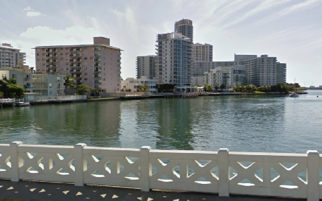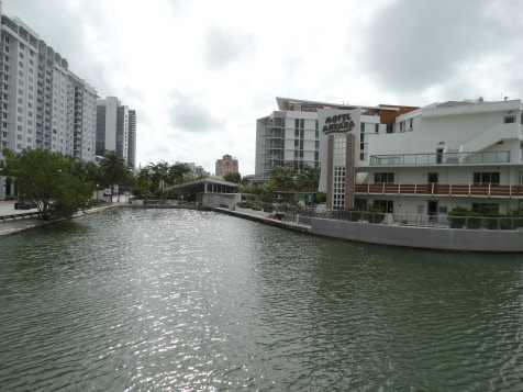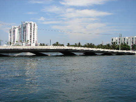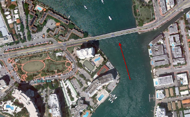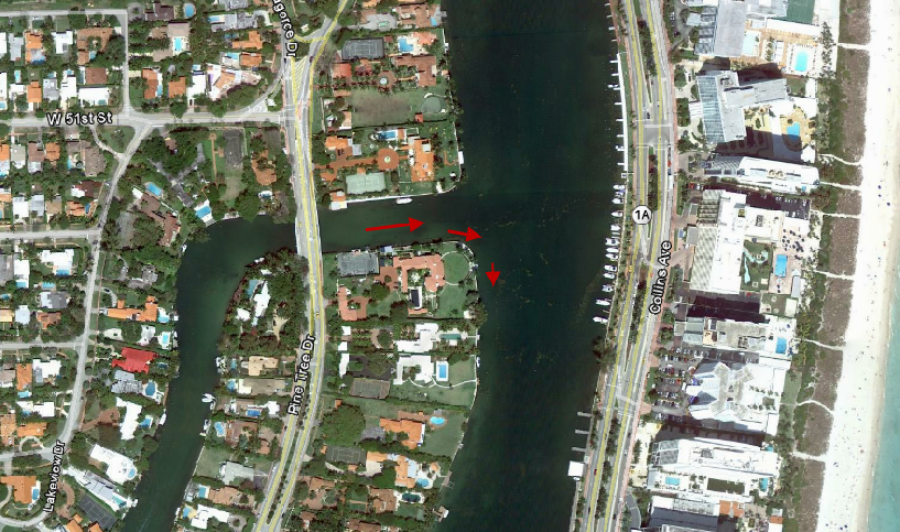 Then we see him round the corner 2.75 miles south southwest of the Pine Tree Drive bridge. Belle Plaza Apartments on Belle Isle are seen in the background (20 Island Ave., Belle Isle). Then he passes under the same section of the Venetian Causeway we first saw him go under.