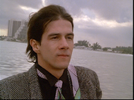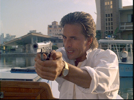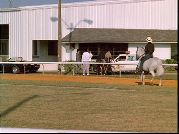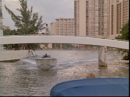 Then we see him go under the footbridge. Instead of turning right down the canal that runs along Dade Blvd., and possibly getting away he goes straight into the dead end and has to stop. Crockett jumps off the bridge as he likes to do and captures Sagot. This is the same footbridge that was used in the movie Bad Boys. The motel in the background will later be used in Jack Of All Trades.