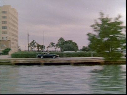 Then we see Crockett and Tubbs driving along. It looks like there are gantry cranes in the background which would indicate that they are eastbound on the MacArthur Causeway (east end near ferry terminal) going by the Port Of Miami/Dodge Island. The background is not clear enough to confirm 100% where they are. Location unsure.