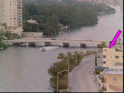 The chase is on. First we see him drive under the far west end of the Venetian Causeway headed north.