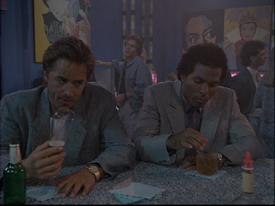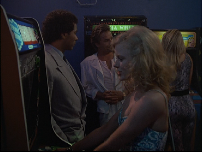 Then we return to Jackson’s hangar at North Perry Airport. Here they negotiate a deal before Jackson’s girlfriend, Lani shows up. Crockett and Tubbs are roped into taking her to the Arc Light. The Arc Light is a Lauderdale meat market, arcade with bad pizza and beer. Crockett and Tubbs are the oldest people in the place and they are not so happy. The interior was all filmed at Greenwich Studios on a set. The establishing exterior shot appears to be stock footage from a Los Angeles location. Location unknown.