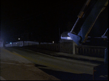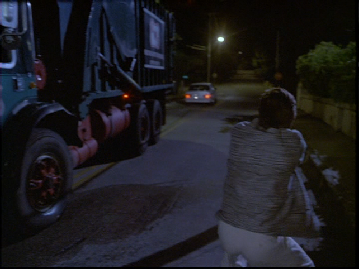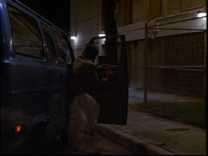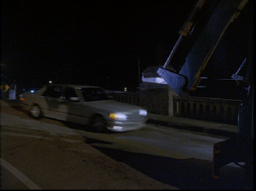 Maynard drives up and over the bridge going around a garbage truck on the far side of the bridge. Tubbs follows over the bridge but drives into the garbage truck. After raising the van into the air Maynard’s assistant, Mr. Hmung jumps into Maynards car and they take off westbound on NW 7th Street.