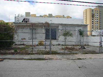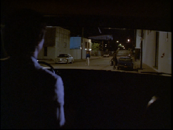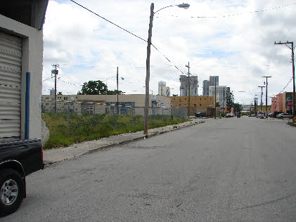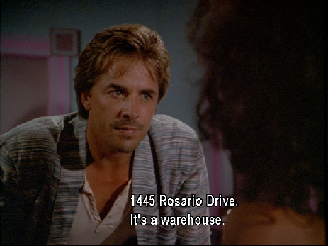 Crockett and Tubbs arrive at the warehouse. This was filmed in Miami on NW 7th Street just west of NW 6th Ave. Crockett gets out and climbs into the building on the north side of the street.